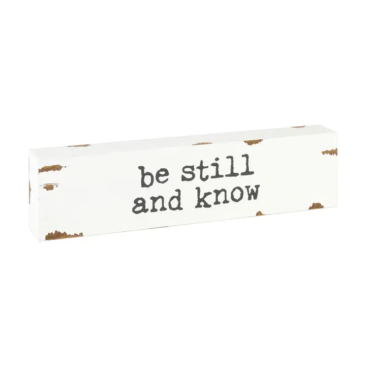Be still sitter, min. 6. Measurements: 8" w x 2" t x 1" d. "Be still and know" chippy white sitter with gray text.