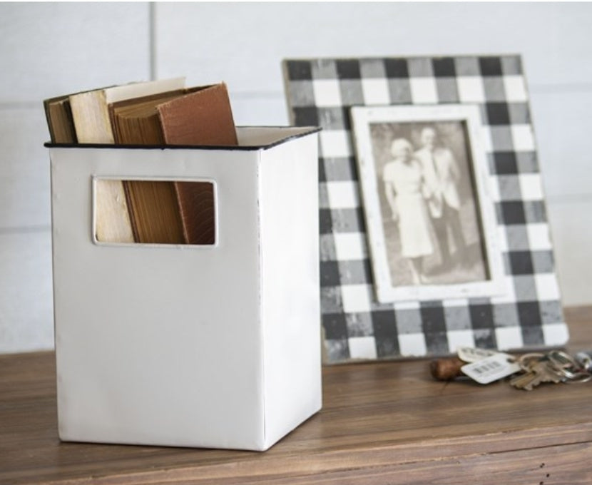 Refresh your decor with this modern farmhouse planter inspired by classic farm enamel finishes. Updated and modernized with a sleek, glossy, white enamel that is accented by bold black detailing on the rim. Two handles are cut out from the sides for added detail and easy transportation. Your greenery and florals will pop against the clean finish when used as a planter. While great for fresh or faux potted plants or stems, it is also perfect for a quick storage solution. MATERIAL: Metal