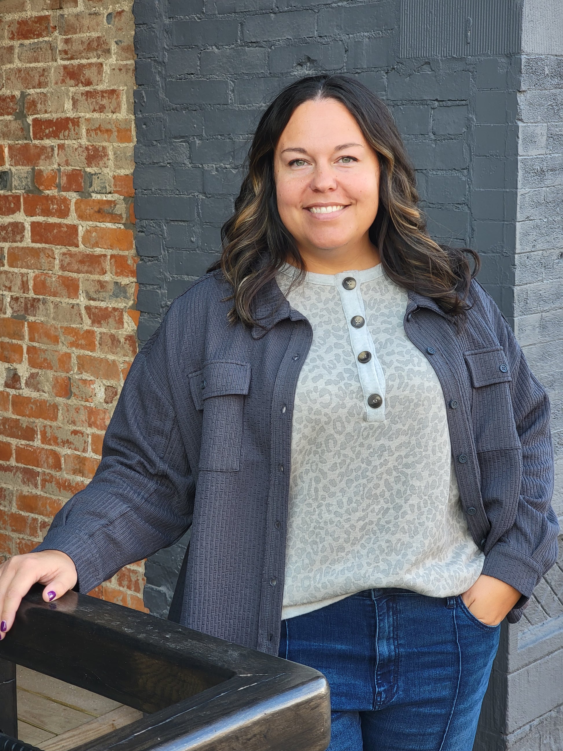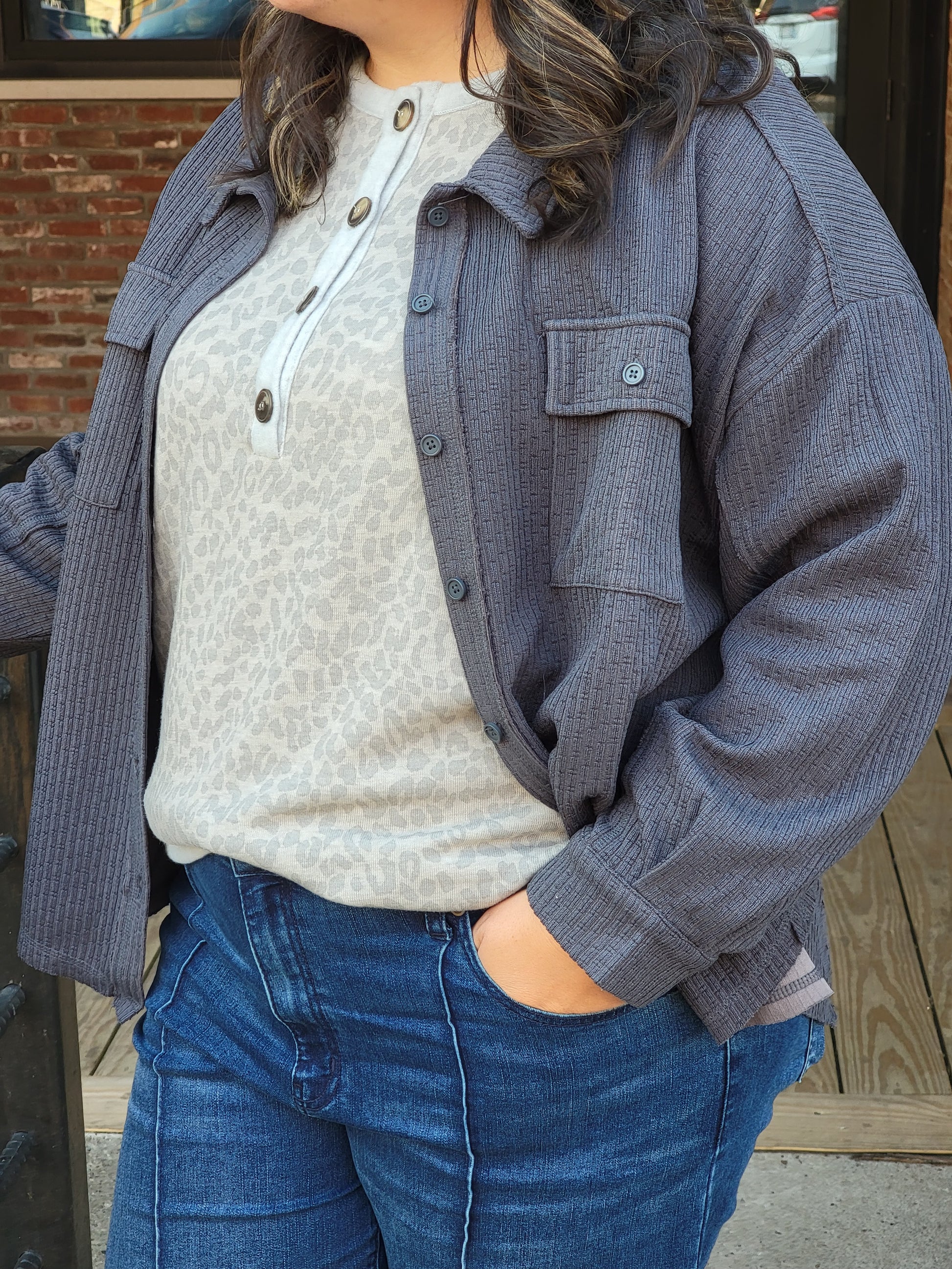 Curvy- Casual Textured Knit Shacket Jacket - Long Sleeve - Button Down - Drop Shoulder - Patch Pockets - Raw Edge Detail