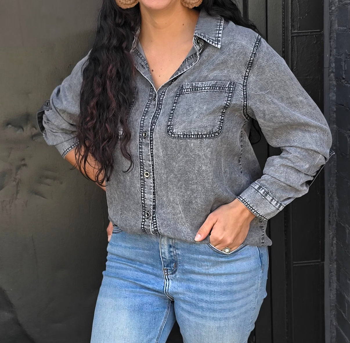 CHAMBARY SHIRTS W POCKETS - Functional Pocket Design: Dual chest pockets with button closures for practical storage - Roll-Tab Sleeves: Adjustable sleeve length with button tabs for secured rolling - Relaxed Fit: Comfortable, loose-fitting silhouette that allows for easy movement - Button Front Closure: Full-length button placket with durable metal buttons STYLE MEASUREMENTS (SIZE SMALL) - TOTAL LENGTH 28 1/2" - BUST 20" - SHOULDER 15 1/2" - SLEEVE LENGTH 24 1/2" 100% TENCEL