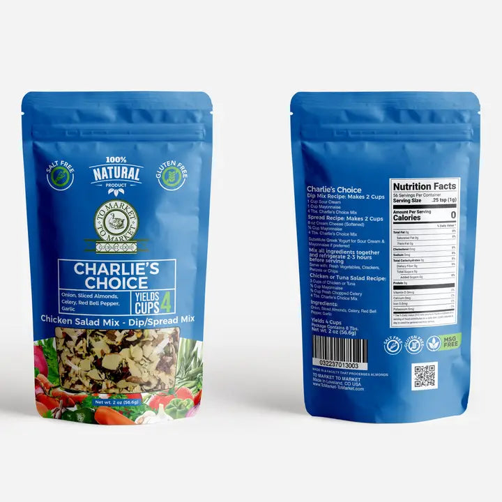 When you start with a blend of almonds, onion, celery and red peppers you will end with terrific tuna, chicken salad, or spread. Charlie's Choice is great made with cream cheese. Make a cheese ball and cover with more silvered almonds. Serve with crackers. Each Case contains (12) 2oz Re-sealable bags of "Charlie's Choice" and two display trays that hold 6 bags each INGREDIENTS: Onion, Almonds, Celery, Red Bell Pepper, Garlic No MSG, No Chemicals, No Preservatives, No Salt, Gluten Free EACH PACKAGE: Yields 3 Batches (1 Batch= 2 Cups of Product) Charlie's Choice Recipes Bagel Buddy ‘N Cracker Backer 3 Tbs CHARLIE’S CHOICE ¼ Cup Mayonnaise 8 oz. Cream Cheese (regular or light), softened 1 Can (6oz) water-packed Albacore Tuna Soften cream cheese and mix all ingredients together. Refrigerate three hours or longer. Serve on bagels, crackers, sourdough, etc. Sandwich Spread Mix 3 Tbs. CHARLIE’S CHOICE with ¾ Cup mayonnaise and 1 Can Tuna. Proceed as above. Pile on your favorite bread