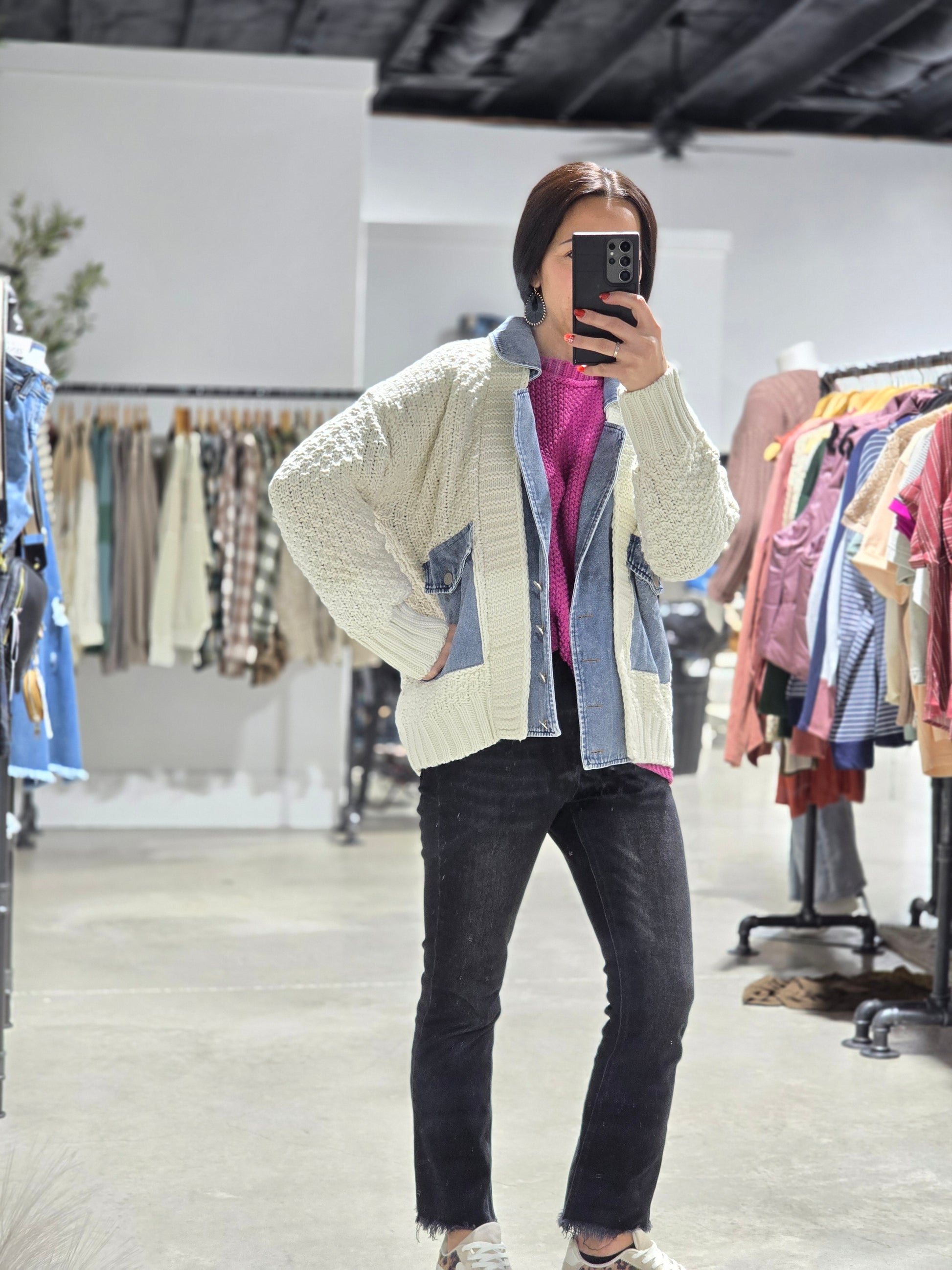 Collared Notch collar long sleeves Pocket detail Button down Cable knit pattern Denim trim detail Mixed media Not lined Jacket Outerwear Self:100%acrylic Contrast:75%cotton 25%spandex