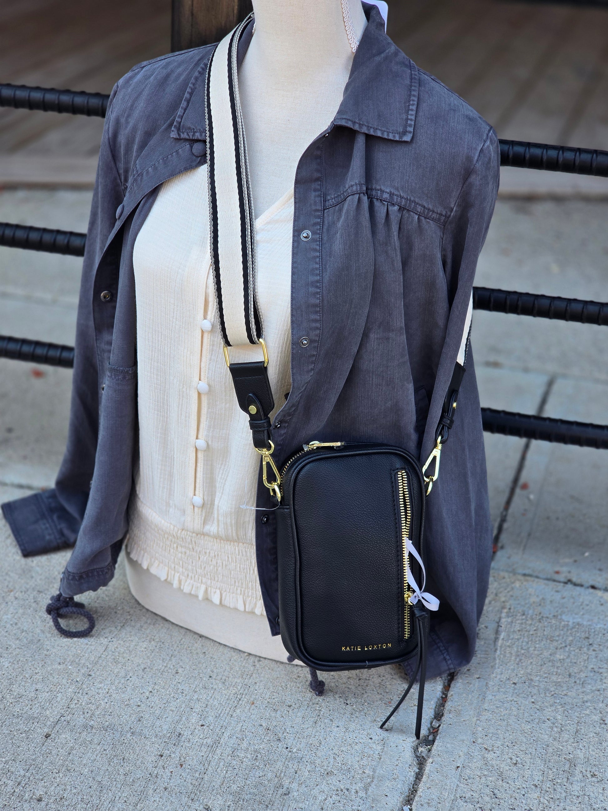 Our Hallie Small Crossbody Bag in Black features a detachable canvas crossbody strap allowing you to easily switch up your look with our available Interchangeable Bag Straps. The front zip pocket makes it the perfect everyday accessory for storing your small essentials while the signature tassel detail coordinates effortlessly with the rest of the Hallie Collection.