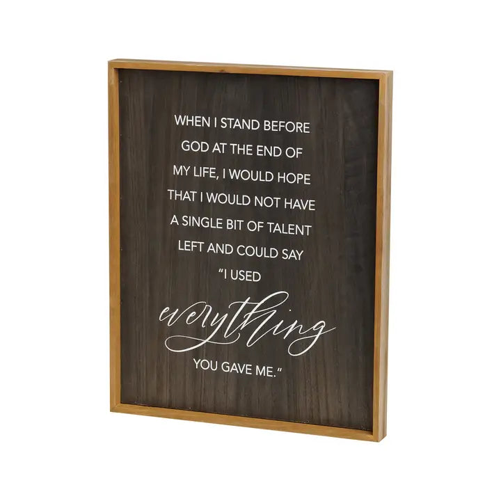 Measurements: 16" W x 20" T x 1 1/2" D Side 1: "Home is where love resides, memories are created, friends always belong and laughter never ends." Wood Washed Framed Sign with Black Washed Wood Background and White Text Side 2: "When I stand before God at the end of my life, I would hope that I would not have a single bit of talent left and could say "I used everything you gave me" " Wood Washed Framed Sign with Black Washed Wood Background and White Text"