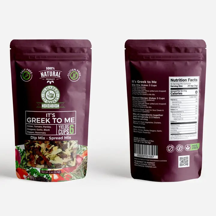 Dip & spread with a Mediterranean flair. A spread that you add kalamata olives and feta cheese to. Awesome! Each Case contains (12) 2oz Re-sealable pouches of "It's Greek to Me!" and 2 display trays that hold 6 bags each. INGREDIENTS: Onion, Tomato, Parsley, Oregano, Garlic, Black Pepper and Rosemary. No MSG, No Chemicals, No Preservatives, No Salt, Gluten-Free EACH PACKAGE: Yields 2 Batches (1 Batch= 2 Cups of Product) As A Spread: 8 oz Cream Cheese softened ½ cup Mayonnaise ½ cup feta cheese, crumbled ½ cup Kalamata olives, pitted and chopped 5 Tbs. It's Greek To Me! Combine all ingredients. Place in an appropriate container and cover. Refrigerate for at least three hours. (It gets even better over time). Serve on bagels, pita bread or crackers. As A Dip: 1 Cup Mayonnaise 1 Cup Sour Cream ½ cup Kalamata olives, pitted and chopped 5 Tbs. It's Greek To Me! Mix all ingredients together and refrigerate at least three hours. Serve with fresh vegetables, crackers, etc.
