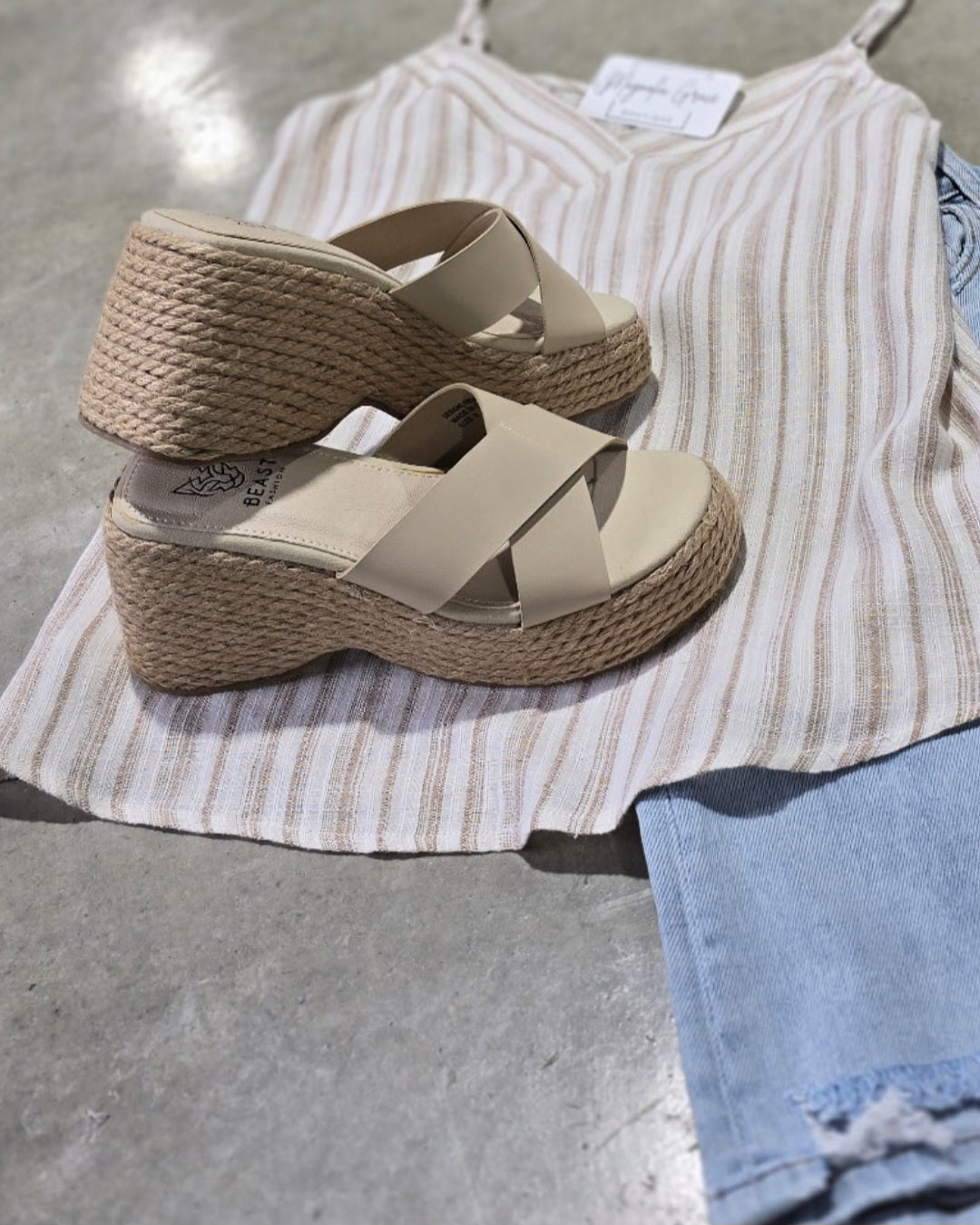 • Material: Faux leather • Heel Height: 3.25 inches • Closure: Slip-on • Fit: True to size • Style: Casual with espadrille detailing