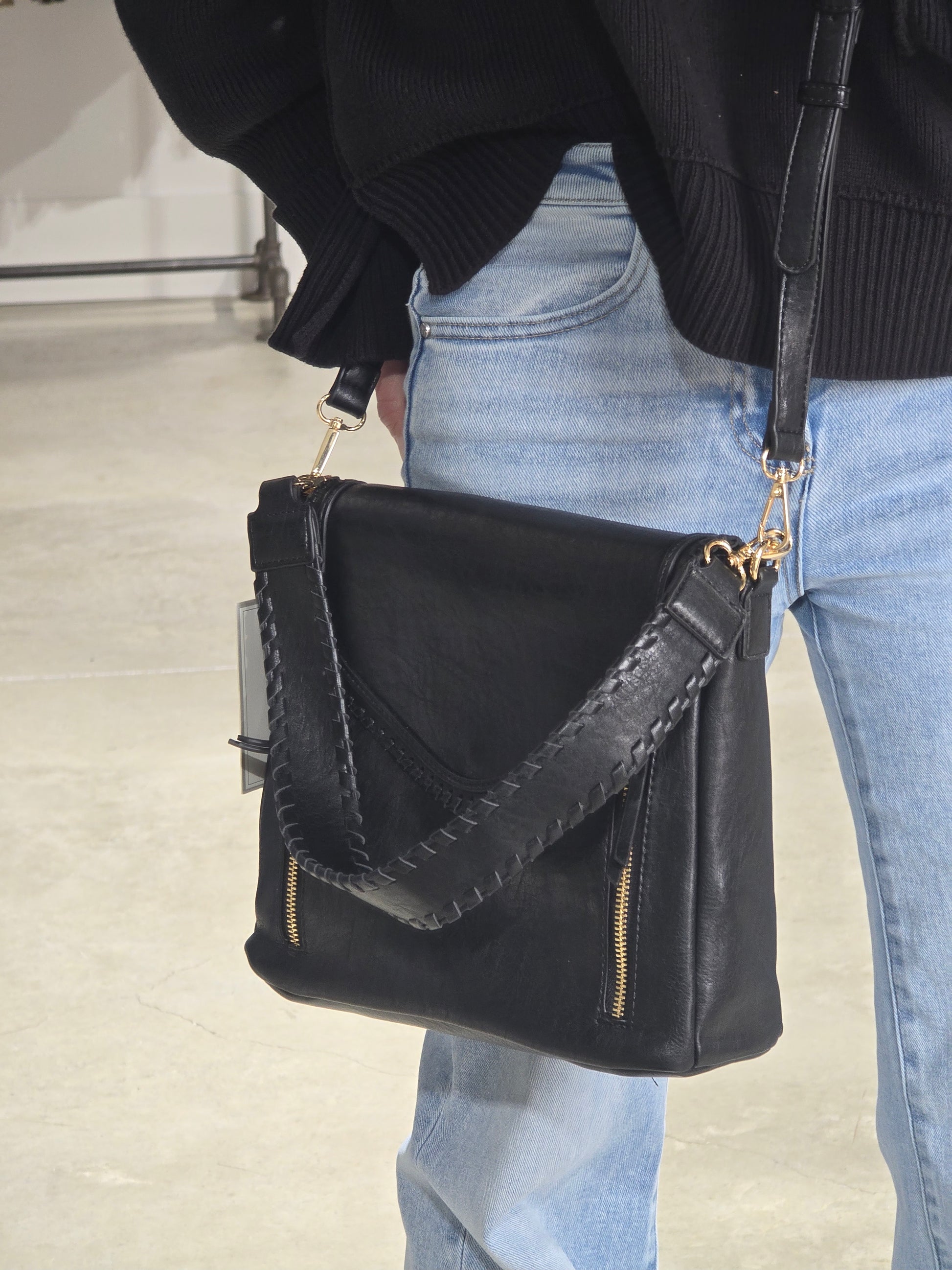 Back zip pocket for additional storage -Inner zip and slip pockets for organization -Removable braided shoulder strap -Removable/adjustable crossbody strap for versatile carrying options -Material: Vegan leather Dimensions: -Length: 10 inches -Height: 12 inches -Depth: 4 inches -Drop: 10 inches