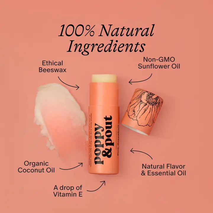 Our Pink Grapefruit Lip Balm has been a best-seller for years due to it's light, fruity scent and hydrating qualities! Every Poppy & Pout lip balm is made with 100% natural ingredients and hand-poured into eco-friendly cardboard tubes. 🌼 100% NATURAL INGREDIENTS We only use ingredients that are 100% natural. No parabens, phthalates, or petrolatum. Our coconut oil is USDA certified organic and we are Leaping Bunny certified cruelty-free! 🌼 DOUBLE THE BALM Our lip balm tubes (0.3 oz) are twice the size of a standard lip balm 🌼 ABOUT POPPY & POUT We have been making our all-natural lip care products by hand in Idaho since 2014. Our lip balms are made from ethically sourced beeswax, organic coconut oil, and sunflower oil. We then add a hint of essential oils and/or natural flavor oils and a drop of Vitamin E. That's it! Simple ingredients for perfectly hydrated lips. 🌼 100% Natural | Cruelty-Free (Leaping Bunny Certified) | Eco-Friendly