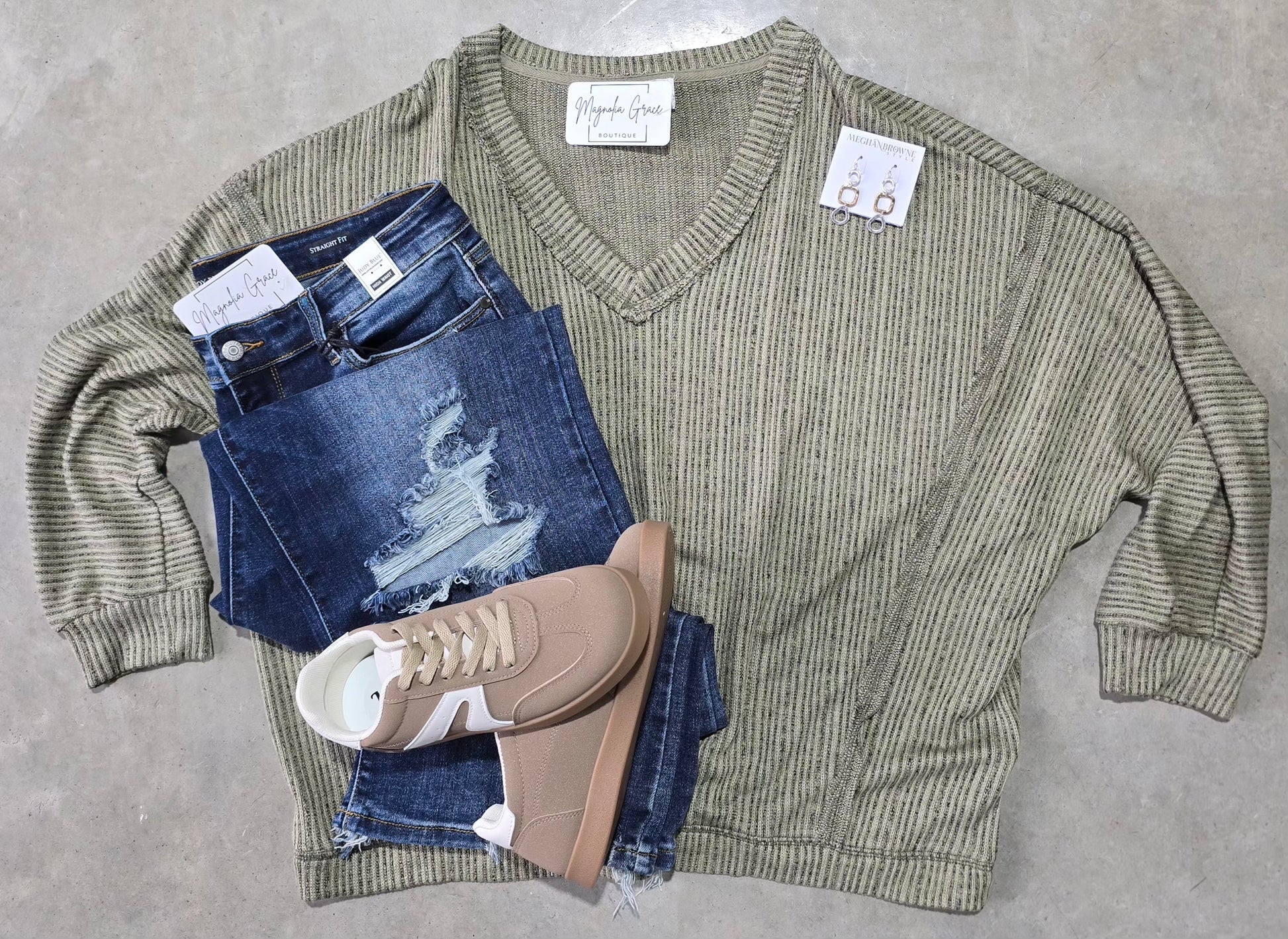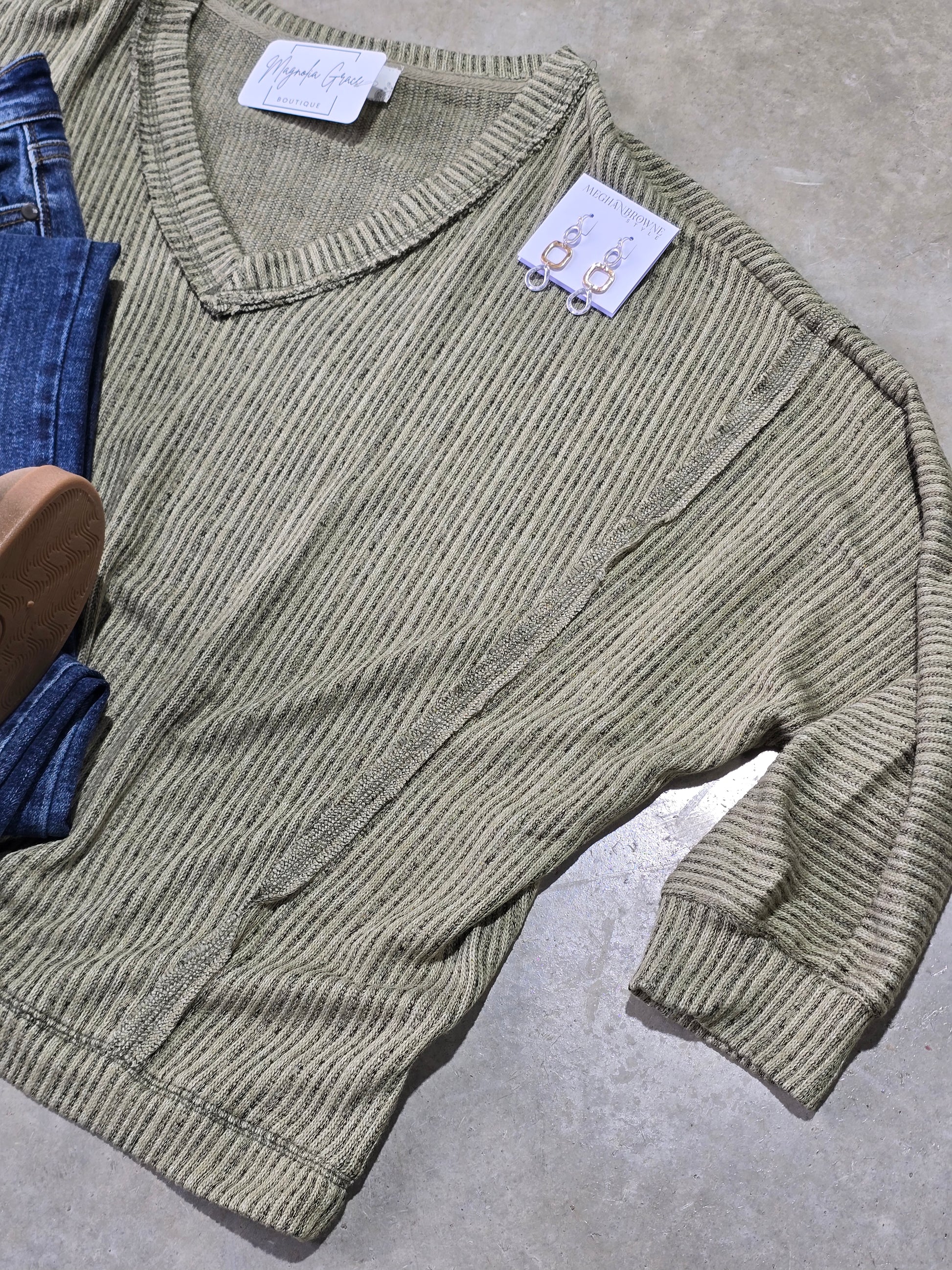 v neckline drop shoulder long sleeves exposed seam raw edge relaxed fit striped knit top 74%rayon, 23%polyester, 3%spandex