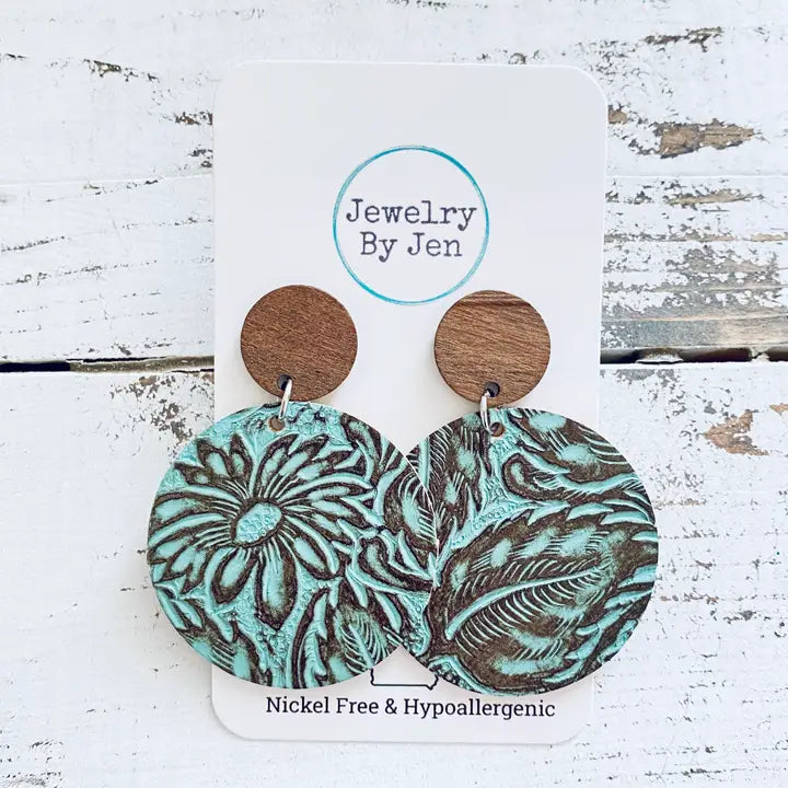 Measures 2 inches long. Wood stud earring with genuine leather circle attached. Stainless steel post. Nickel free and hypoallergenic. Due to display settings on your device, colors may appear different.