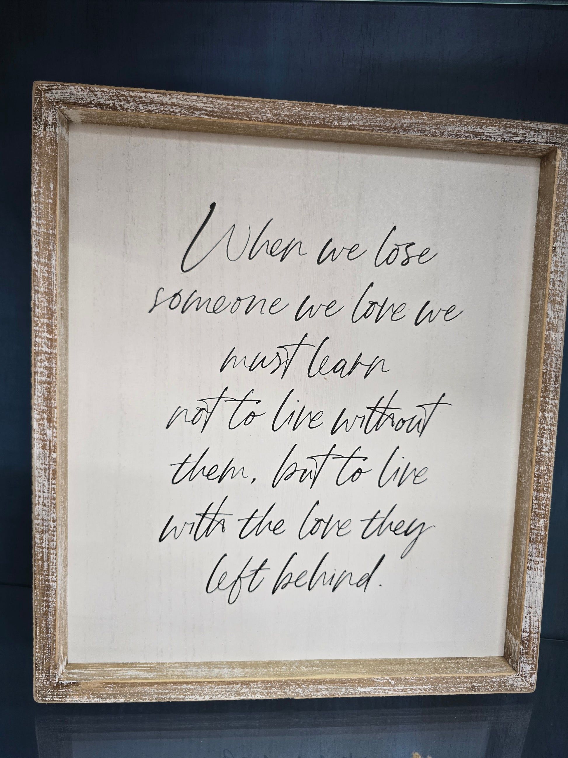 Embrace the profound wisdom and comfort of cherished memories with this beautifully crafted wood frame sign from the Remember When Collection. Measuring 12x14x1.5 inches, the sign features a deeply meaningful quote: "When We Lose Someone We Love, We Must Learn Not to Live Without Them, But to Live with the Love They Left Behind." The classic white and black color scheme offers a timeless elegance, while the robust wood frame adds a touch of rustic charm. Perfect for creating a serene and reflective space, this sign serves as a heartfelt reminder of the enduring love and presence of those who have passed, enriching your home with a sense of lasting connection.