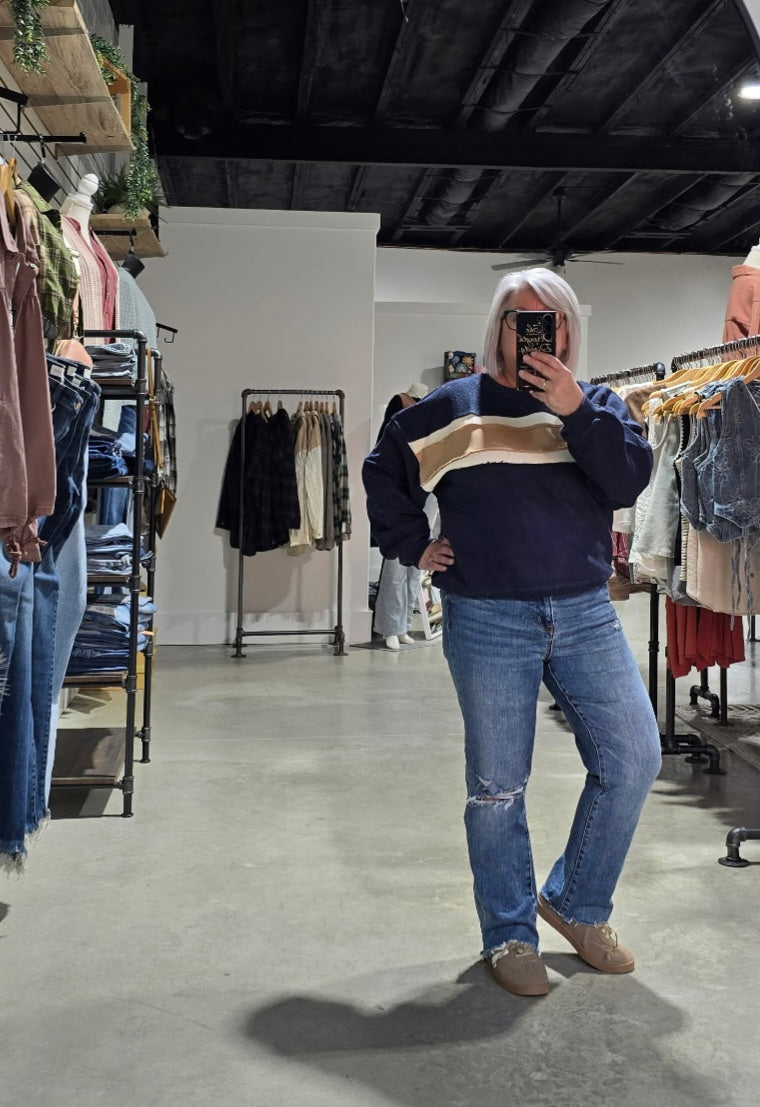 featuring a relaxed fit silhouette with contrast stripe detailing at the front and dropped dolman sleeves for added shape.